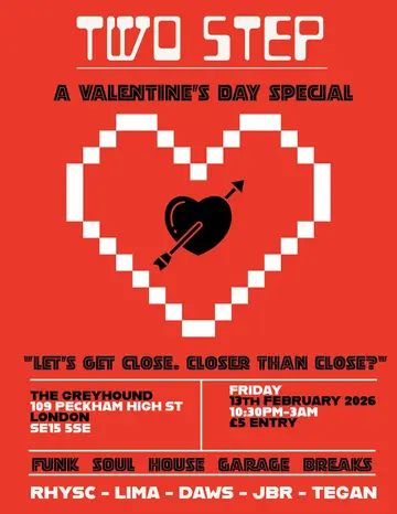 TWO STEP 002 - VALENTINES DISCO takes place at The Greyhound in London, United Kingdom on Friday, February 13, 2026. Breakbeat, House.
