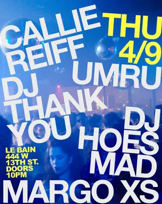 umru, Callie Reiff, Margo XS, DJ HOES MAD & DJ Thank You on April 9, 2026 at Le Bain, New York City features umru, Callie Reiff, Margo XS and DJ Thank You performing DJ sets.