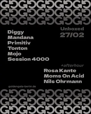 Unboxed on February 27, 2026 at Golden Gate, Berlin features Mandana, tonton, Mojo (US), session 4000, Rosa Kante, Moms on Acid and Nils Ohrmann performing DJ sets.