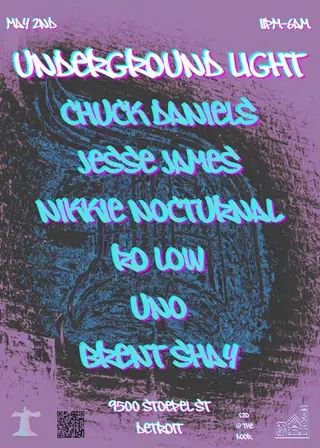Underground Light takes place at Church/Detroit in Detroit, United States on May 2, 2026. Featuring Chuck Daniels, Ro Low, Nikkie Nocturnal, Brent Shay. Techno and House sounds all night.