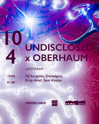UNDISCLOSED X OBERHAUM takes place at Hal25 in Amsterdam, Netherlands on April 10, 2026. Featuring Kray Atief. Techno and Experimental sounds all night.