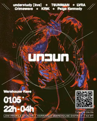 UNDUN takes place at Low Profile Studios in London, United Kingdom on May 1, 2026. Featuring TSUNIMAN, LVRA. Techno and IDM sounds all night.