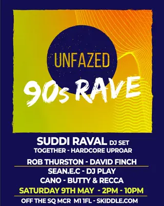 Unfazed 90s Day Rave takes place at Off The Square in Manchester, United Kingdom on May 9, 2026. Club sounds all night.
