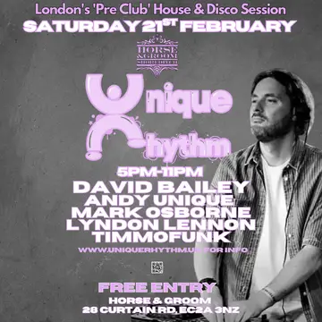 Unique Rhythm free Feb daytime party takes place at The Horse & Groom in London, United Kingdom on Saturday, February 21, 2026. Featuring Mark Osborne. House, Disco.