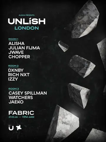 Experience UNLISH: ALISHA, Julian Fijma jWave, DXNBY, Rich NXT, Izzy, Casey Spillman, Watchers, Jaeko 2026, a significant moment in London, United Kingdom's electronic music calendar on Friday, March 27, 2026, featuring ALISHA, Julian Fijma, jWave and 6 more artists. This event brings together artists and fans who share a passion for dance music culture and electronic sounds.