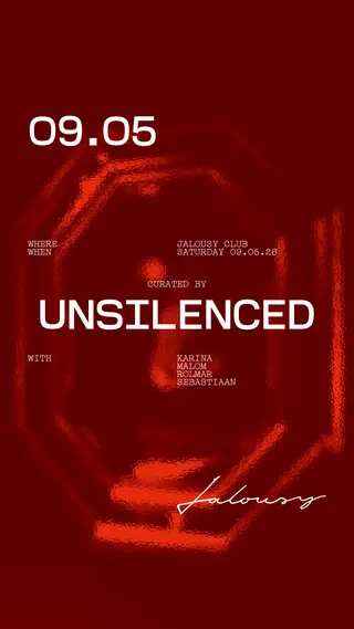 Unsilenced takes place at Jalousy in Brussels, Belgium on May 9, 2026. Featuring Karina., Malom, ROLMAR, Erik Sebastiaan. House and Electro sounds all night.