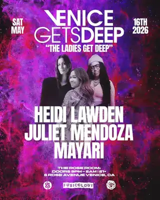 Venice Gets DEEP with Heidi Lawden, Juliet Mendoza & Mayari takes place at The Rose Room in Los Angeles, United States on May 16, 2026. Featuring Heidi Lawden, Juliet Mendoza, Mayari. House and Deep House sounds all night.