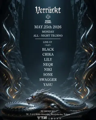 Verrückt on May 25, 2026 at T2 Shinjuku, Tokyo features BLACK(JP), CHIKA, NIKI (JP) and SWAGGER performing techno DJ sets.