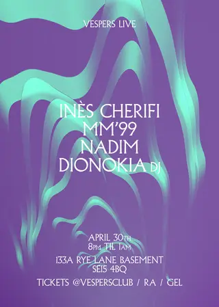 Vespers Live with Inès Cherifi, MM'99, NADIM, Dionokia on April 30, 2026 at Vespers Club, London features Inès Cherifi performing experimental DJ sets.