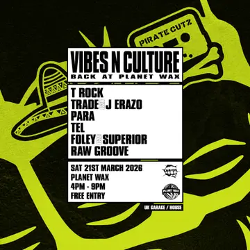 VIBES N CULTURE takes place at Planet Wax in London, United Kingdom on Saturday, March 21, 2026. Featuring Trade. House, Garage.