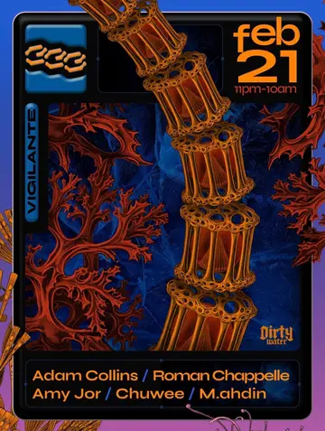 Vigilante: Adam Collins, Chuwee, Amy Jor takes place at TBA - 333 in New York, United States on Saturday, February 21, 2026. Featuring Adam Collins, Chuwee, Amy Jor, Roman Chappelle. Minimal.
