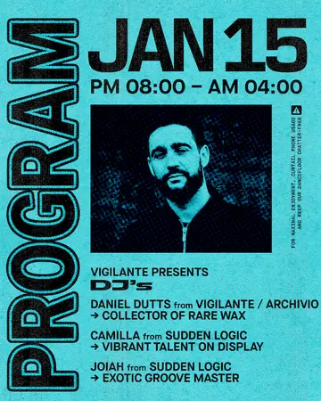 Vigilante presents: Daniel Dutts takes place at Outer Heaven in New York, United States on Thursday, January 15, 2026. Featuring Daniel Dutts, Joiah, CAMILLA.