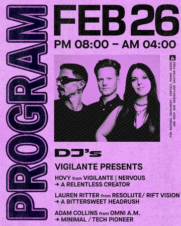 Vigilante presents: Hovy (EP Release Party) + Lauren Ritter & Adam Collins takes place at Outer Heaven in New York, United States on Thursday, February 26, 2026. Featuring Hovy, Lauren Ritter, Adam Collins. House.