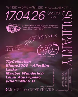 vis-a-vis Kollektiv SoliParty takes place at Mom's Limousine Service in Berlin, Germany on April 17, 2026. Featuring Laska, Lenni Aqua b2b ohne nix. Trance and House sounds all night.