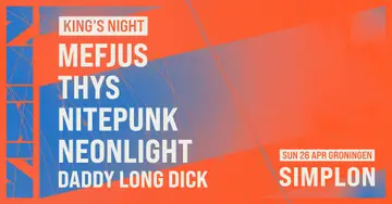 Vision: King's Night takes place at Simplon in All, Netherlands on Sunday, April 26, 2026. Featuring Mefjus, Thys, Nitepunk, Neonlight. Drum & Bass.