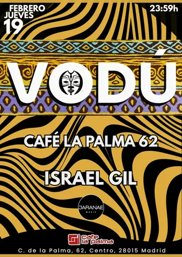 Vodú llega a Café La Palma como una sesión creada para la pista. House en fusión con afrobeat, percusiones orgánicas, melodías instrumentales y voces africanas que construyen un viaje rítmico, hipnótico y lleno energía. Una propuesta alegre y envolvente que conecta con la esencia del club: música que fluye, buena vibra y una pista que no se detiene. Vodú invita a bailar si etiquetas, a perderse en el groove y dejarse llevar, donde el ritmo actúa como lenguaje común y la pista se transforma en un espacio de conexión colectiva. Israel Gil: DJ y productor madrileño especializado en la mezcla de beats house, afrobeat, tribal, disco, músicas del mundo y electrónica. Su filosofía gira en torno a la fusión de géneros y la creación de energía en la pista, ofreciendo sets dinámicos y envolventes que invitan al baile. Con experiencia en eventos y salas de renombre, se distingue por su cuidada selección musical, sonidos alegres y vibrantes y a capacidad de transmitir buena energía al público, convirtiendo cada sesión en una experiencia.