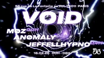 Void W/ Møz , Anømaly, Jeffellhypno takes place at Studio56 in Barcelona, Spain on Monday, February 16, 2026. Featuring ANØMALY. Techno.