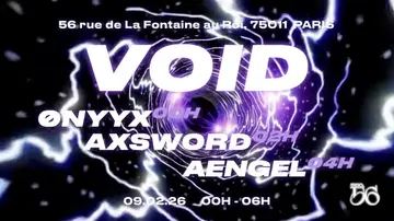 Void W/ Ønyyx , Axsword, Ængel takes place at Studio56 in Barcelona, Spain on Monday, February 9, 2026. Featuring Ængel. Techno.