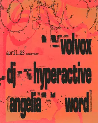 Volvox - DJ Hyperactive - Angelia Word on April 3, 2026 at smartbar, Chicago features Volvox, DJ Hyperactive and Angelia Word performing techno DJ sets.