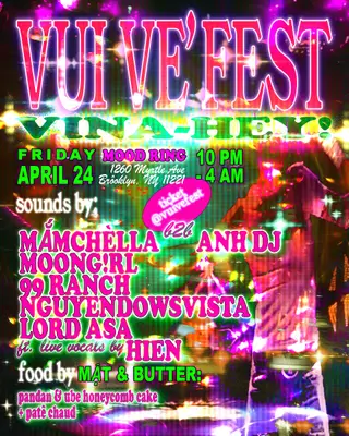 VUI VẺ FEST: VINA-HEY takes place at Mood Ring in New York City on April 24, 2026. The lineup features several artists known for their contributions to electronic music. moong!rl is recognized for her experimental pop sound. 99 ranch brings a blend of electronic and hip-hop influences. nguyendowsXP is noted for his unique take on the electronic genre, incorporating elements of club music. LORD ANNA, known for her techno productions, has been influential in the underground scene. HIEN adds to the lineup with her distinctive electronic style. This event showcases a variety of electronic genres.
