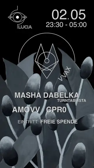 VVAX w / Masha Dabelka on May 2, 2026 at Club Lucia, Vienna features Masha Dabelka, AMOVV and CPR0 performing techno DJ sets.