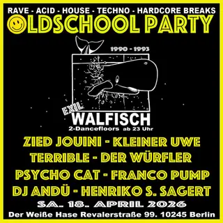 Walfisch / Exil Oldschoolpartyy takes place at Der Weiße Hase in Berlin, Germany on April 18, 2026. Featuring Terrible, Der Würfler, Franco Pump, Henriko S. Sagert. Techno sounds all night.