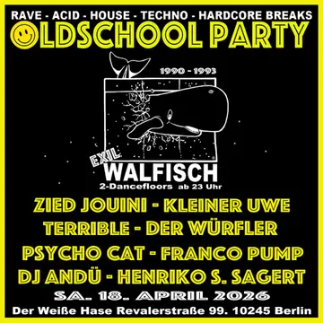 Walfisch / Exil Oldschoolpartyy takes place at Der Weiße Hase in Berlin, Germany on April 18, 2026. Techno.