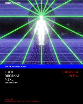 [WAREHOUSECREW] on April 24, 2026 at BBCB: Beton Brut+Concrete Bar, Seoul features lucii, rerekat and M2XL performing techno DJ sets.