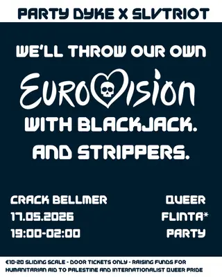 We'll Throw Our Own Eurovision. with Blackjack. and Strippers/ takes place at Crack Bellmer in Berlin, Germany on May 17, 2026. Featuring bethanylikesham. Disco and Pop sounds all night.