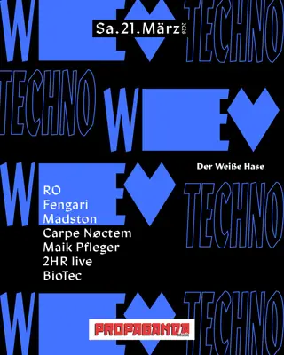 We Love Techno with Propaganda Mudic takes place at Der Weiße Hase in Berlin, Germany on March 21, 2026. Featuring Carpe Noctem, BioTec -official-. Techno sounds all night.