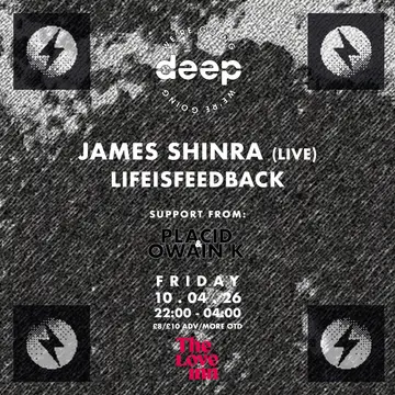 We're Going Deep with James Shinra, LIFEISFEEDBACK + residents takes place at The Love Inn in Bristol, United Kingdom on Friday, April 10, 2026. Featuring James Shinra, Owain K, Placid. Bass, Tech House.