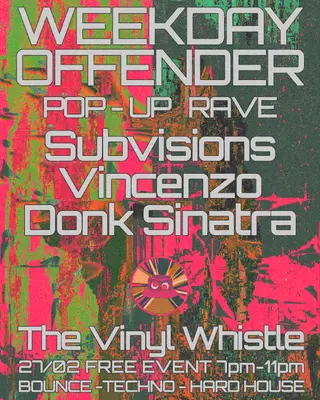 Weekday Offender: Hard Dance Pop Up Rave takes place at The Vinyl Whistle in Paris, France on February 27, 2026. Featuring SUBVISIONS. Trance and Techno sounds all night.