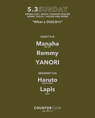 What a DISCO!!! on May 3, 2026 at COUNTER CLUB, Tokyo features Remmy performing DJ sets.