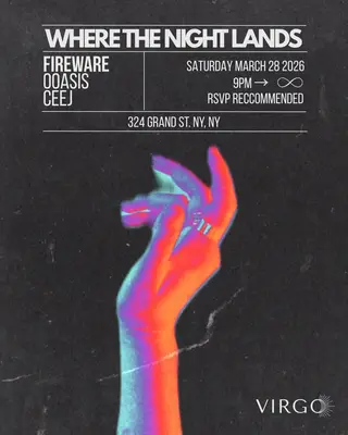 Set at Virgo, Where The Night Lands feat. FIREWARE 03/28 2026 brings together artists and fans in New York on Saturday, March 28, 2026. This event brings together artists and fans who share a passion for dance music culture and House, Deep House sounds.