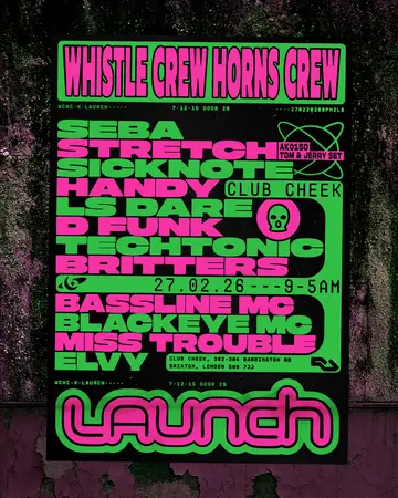 Whistle Crew Horns Crew X Launch takes place at Club Cheek in London, United Kingdom on Friday, February 27, 2026. Featuring Seba, DJ Stretch, Sicknote, Miss Trouble. Drum & Bass, Jungle.