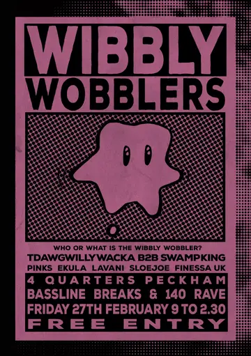 WIBBLY WOBBLERS 4 Too Wobbly The time for questioning the Wibbly Wobbler’s existence is over. Sightings are on the rise as we continue to receive anonymous tips on bass-heavy mischief across the city. Its form however? Unknown. Its motives? Questionable. Its taste in music? Impeccable. Peckham Rye, 2:14am – Witnesses report a “rubbery silhouette” emerging from the mist, nodding aggressively to a ghostly 2-step rhythm before vanishing, leaving behind a faint smell of Red Bull and rewinds. South London Bus Stop, undisclosed location – A commuter claims their headphones suddenly synced to an invisible sound system. CCTV shows a wobbling blur performing what looked like finger guns before dissolving into the night. The only way to summon (or possibly trap) the Wibbly Wobbler is through serious sonic pressure. That’s where TDawgwillywacka, Swamp King, Pinks, Ekula, Lavani, Sloejoe & Finessa UK come in — delivering wobblers, rollers, face-scrunchers and pure nonsense until the entity reveals itself… or possesses the dancefloor entirely. Come curious. Leave wobbled. Wibbly Wobblers at Four Quarters Peckham. You might not find out what the Wibbly Wobbler is — but it will definitely find you.