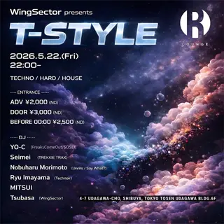 WingSector presents T-Style takes place at R Lounge in Tokyo, Japan on May 22, 2026. Featuring Seimei, Nobuharu Morimoto. Techno and House sounds all night.