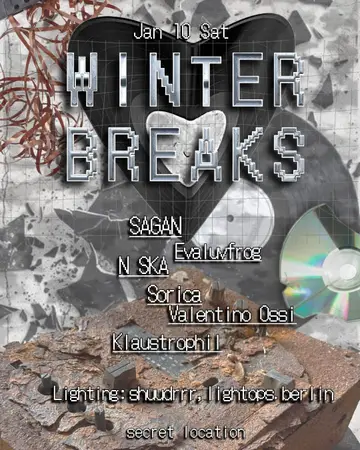 Winterbreaks takes place at TBA - Secret Location in Berlin, Germany on Saturday, January 10, 2026. Featuring Gościńska, SAGAN, Evaluvfrog, Sorica.