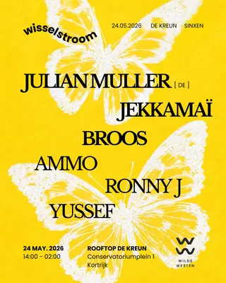 Wisselstroom - Open Air Rooftop takes place at De Kreun in All on May 24, 2026. The lineup features Julian Muller, a techno producer from the Netherlands known for his energetic sets. JEKKAMAÏ, also from the Netherlands, brings a distinctive blend of electronic styles and is recognized for his innovative soundscapes. BROOS, an emerging artist in the electronic scene, showcases his dynamic approach to house music. Lastly, Ronny J, known for his contributions to the trap and hip-hop genres, adds a unique flavor to the event. This open-air rooftop event will highlight a range of electronic music styles.