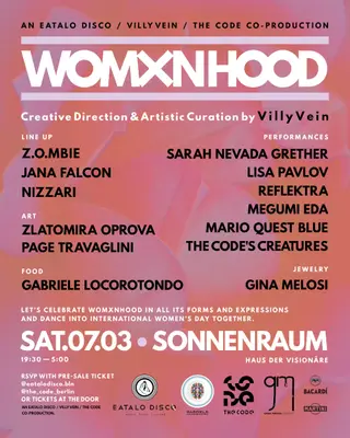 WOMXNHOOD – 7 MARCH 2026 / Haus der Visionäre Berlin on March 7, 2026 at Sonnenraum, Berlin features Z.O.mbie, Jana Falcon and Nizzari performing house DJ sets.