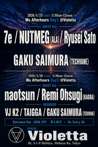 Wu Afterhours with 7e, NUTMEG, Ryusei Sato,GAKU SAIMURA on April 25, 2026 at Violetta, Tokyo features 7e, NUTMEG, Ryusei Sato and AMG SAIMURA (TECHVANE) performing techno DJ sets.