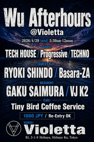 Wu Afterhours,5:30am-12noon,RYOKI SHINDO,Basara-Za,GAKU SAIMURA,VJ K2,Tiny Bird Coffee Service takes place at Violetta in Tokyo, Japan on April 29, 2026. Featuring AMG SAIMURA (TECHVANE). Techno and Tech House sounds all night.