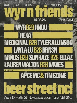 WYR N FRIENDS takes place at Beer Street in Newcastle, United Kingdom on March 14, 2026. Drum & Bass and Dubstep sounds all night.