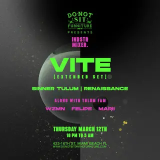 On Thursday, March 12th, the renowned party collective Not Sit On The Furniture takes over Miami's vibrant electronic scene with a special extended set by VITE, known for his deep, pulsating house rhythms and immersive soundscapes. Hailing from Sinner Tulum and a notable name in the Renaissance collective, VITE’s performances are a staple for those seeking a deeper dive into the realms of house music. Joining him are local favorites WZMN, Felipe, and Marii, each bringing their own flair to the night. WZMN blends melodic grooves with a touch of tech house, while Felipe, a Miami native, infuses his sets with rich, bass-heavy beats that resonate with the crowd. Marii’s eclectic style weaves through genres, ensuring an engaging atmosphere throughout the night. Set against the backdrop of Do Not Sit On The Furniture, a venue celebrated for its intimate vibe and artistic decor, this event promises a night steeped in the essence of Miami's thriving electronic music culture.
