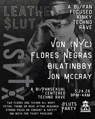 Xtasy IX: Leather $lut - IML Weekend (Bi/Pansexual Kinky Techno Rave) takes place at The Jackhammer Chicago in Chicago, United States on May 24, 2026. Featuring Von, Flores Negras, BiLatinBby, Jon McCray. Techno and Acid sounds all night.