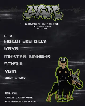 YGM PRESENTS: KAYA, SENSHI, MARTYN KINNEAR, HDILLA B2B DILLY & YGM HOSTED BY SMOKE takes place at Bar 105 in Cardiff, Unknown on Saturday, March 28, 2026. Dubstep, Grime.
