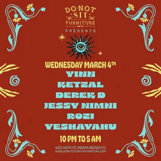 Yin, Kitzal, Derek D, Jessy Nimni takes place at Do Not Sit On The Furniture in Miami, United States on March 4, 2026. Featuring Derek D. House and Deep House sounds all night.