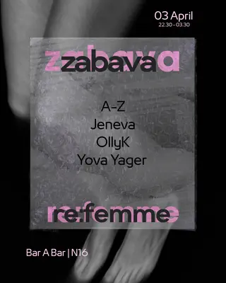 ZABAVA || re:femme takes place at Bar A Bar in London, United Kingdom on April 3, 2026. Featuring Jeneva, OllyK, Yova Yager. Techno sounds all night.