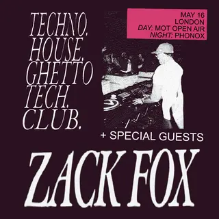 Zack Fox (DJ Set) takes place at M.O.T in London, United Kingdom on May 16, 2026. Featuring Zack Fox. Electro and Ghetto Tech sounds all night.