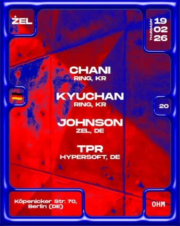 ZEL takes place at OHM in Berlin, Germany on Thursday, February 19, 2026. Featuring chani, Kyuchan, Johnson (2), TPR (DE). Techno, House.